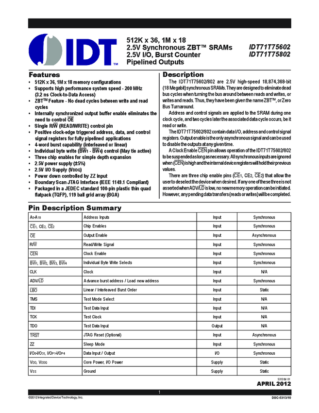 71T75802S166PFGI 2.5V 1M X 18 ZBT Synchronous 2.5V I/O PipeLine SRAM