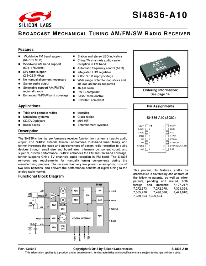 SI4836-A10-GS RF Receiver AM/FM/SW 3.3V 16-Pin SOIC Tube