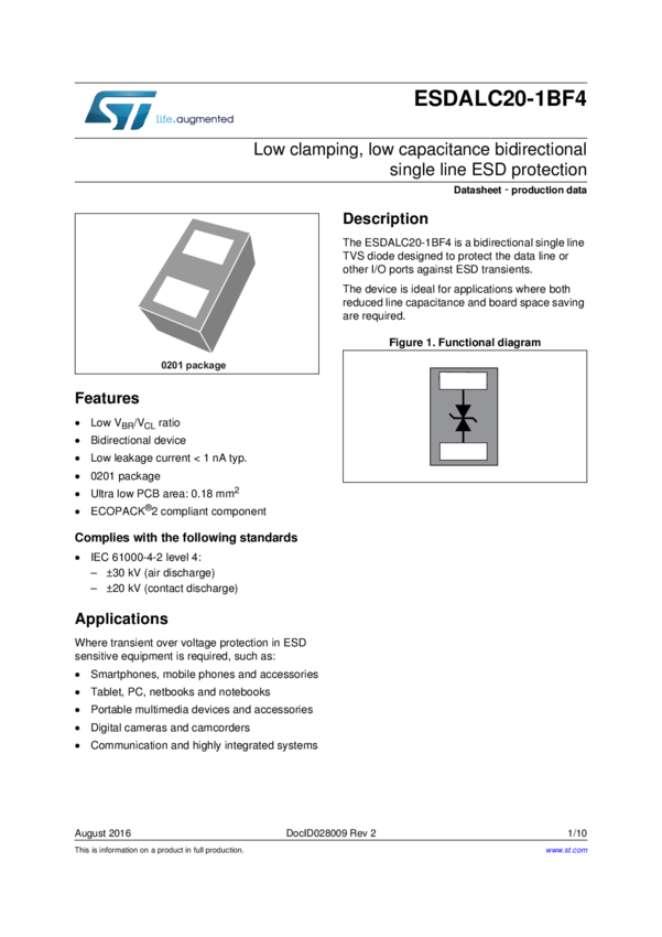 ESDALC20-1BF4 ESD Suppressor TVS ±30kV 2-Pin 0201 T/R