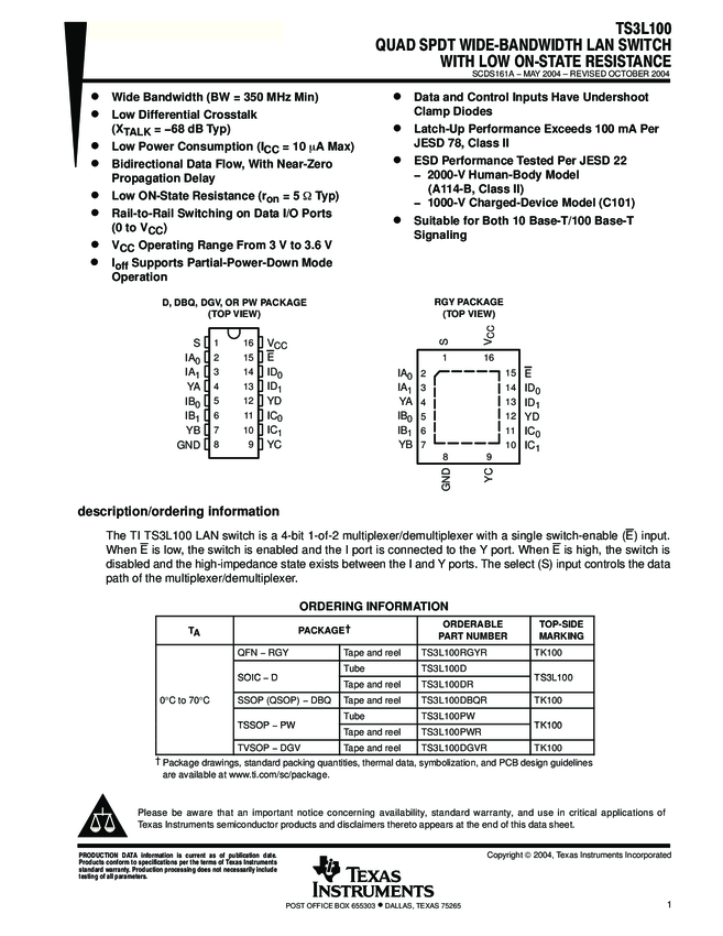 TS3L100PW Analog Switch Quad SPDT 16-Pin TSSOP