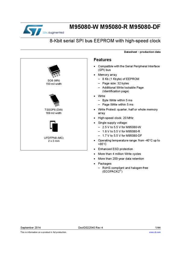 M95080-RMN6P EEPROM Serial-SPI 8K-bit 1K x 8 2.5V/3.3V/5V 8-Pin SO N Tube
