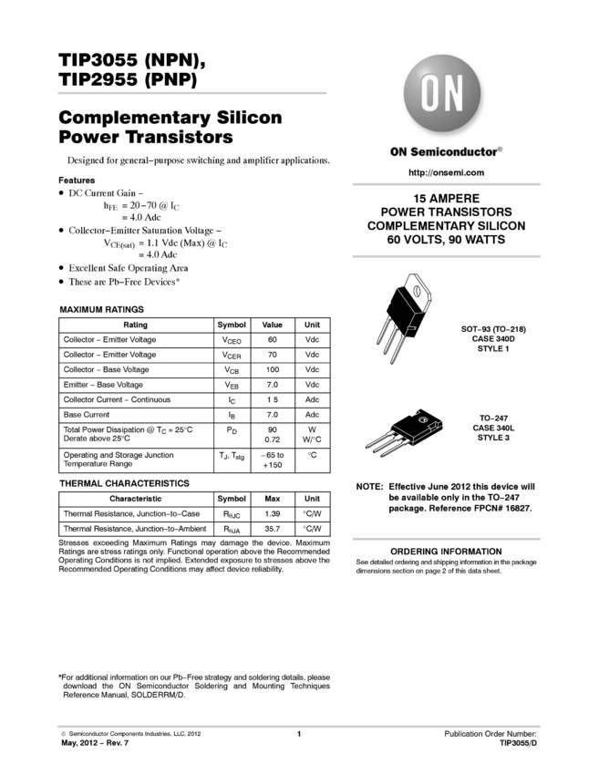 TIP2955G 15 A, 60 V PNP Bipolar Power Transistor