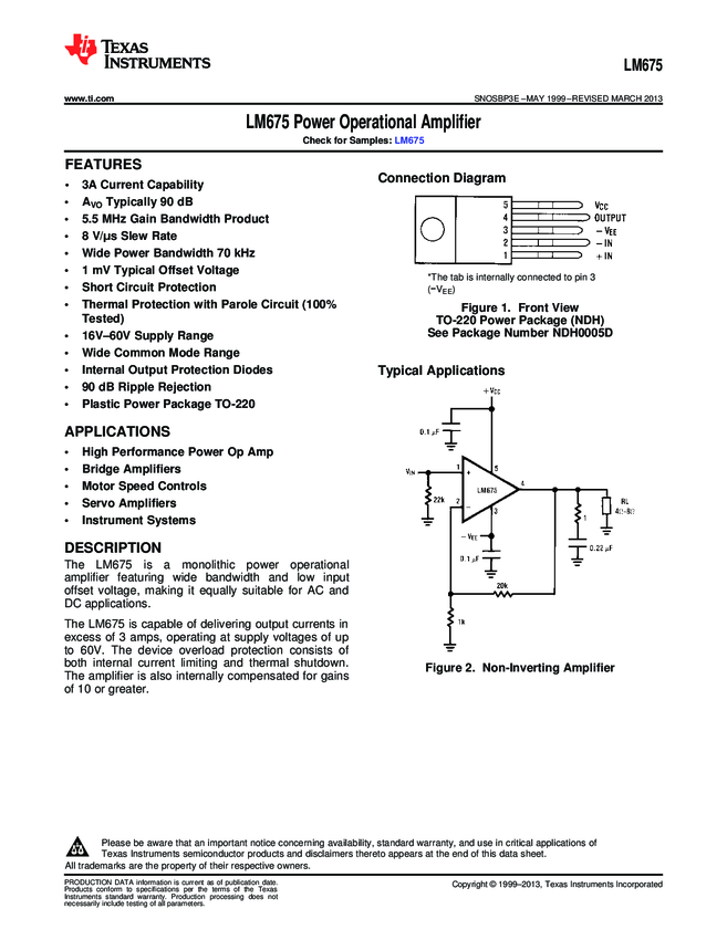 LM675T OP Amp Single GP ±30V/60V 5-Pin(5+Tab) TO-220 Rail