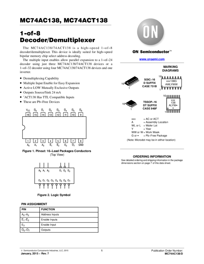 MC74ACT138DR2G Decoder/Demultiplexer Single 3-to-8 16-Pin SOIC T/R