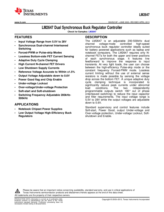LM2647LQX/NOPB DC DC Cntrlr Dual-OUT Sync Buck 5.5V to 28V Input 28-Pin LLP EP T/R