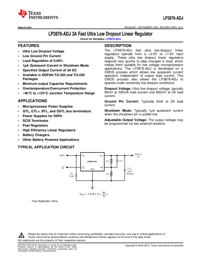 LP3876ES-ADJ/NOPB LDO Regulator Pos 1.216V to 6.2V 3A 6-Pin(5+Tab) TO-263 Rail