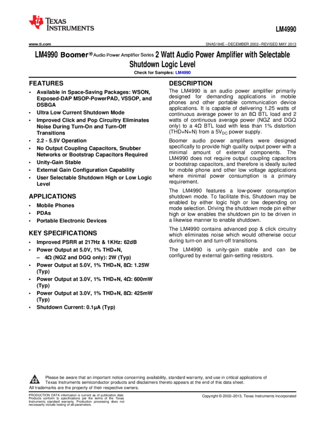 LM4990MH/NOPB Audio Amp Speaker 1-CH Mono 2W Class-AB 10-Pin TSSOP EP T/R
