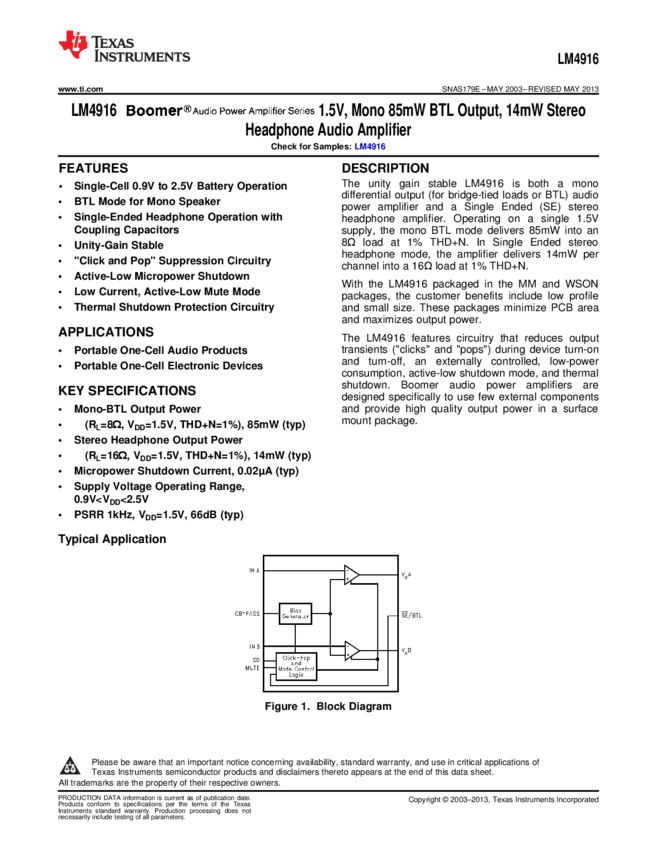LM4916LDX/NOPB Audio Amp Headphone/Speaker 1-CH Mono/2-CH Stereo 0.085W Class-AB 10-Pin LL...
