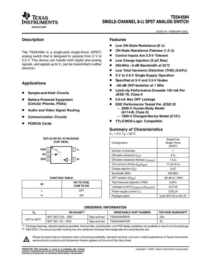 TS5A4594DCKR Analog Switch Single SPST 5-Pin SC-70 T/R