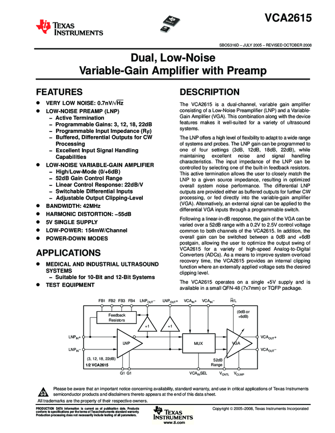 VCA2615RGZR Variable-Gain Amplifier with Preamp 48-Pin VQFN EP T/R