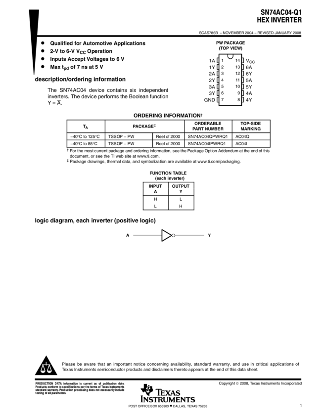 SN74AC04QPWRQ1 Inverter 6-Element CMOS 14-Pin TSSOP T/R