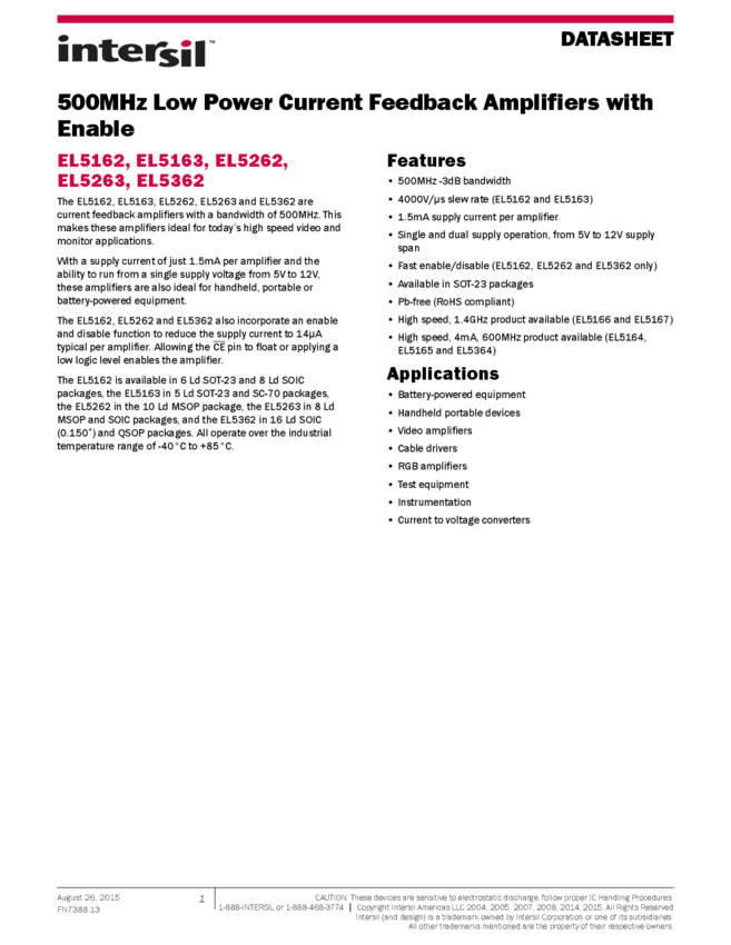 EL5162ISZ-T7, EL5163IWZ-T7A, EL5262IYZ, EL5362ISZ-T7, EL5362IUZ