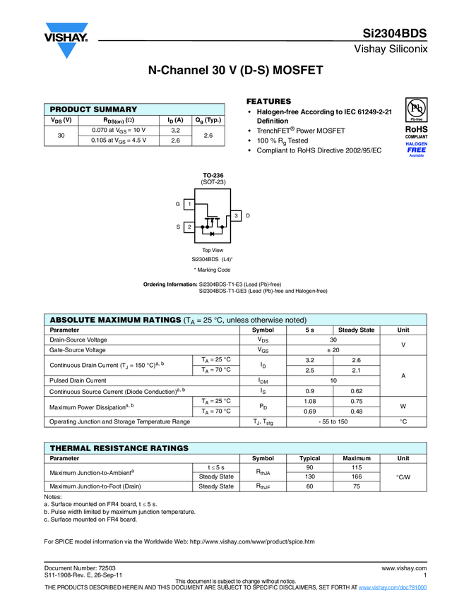 Si2304BDS-T1-E3 Trans MOSFET N-CH 30V 2.6A 3-Pin SOT-23 T/R