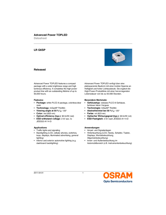 LR G6SP-CBEA-1-1-Z LED Uni-Color Red 24lm 634nm Chip LED 6-Pin PLCC T/R