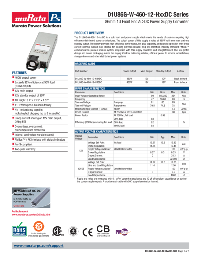 D1U86G-W-460-12-HB3DC AC/DC Power Supply Single-OUT 12V 38.3A 460W