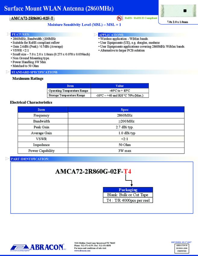AMCA72-2R860G-02F-T4 Antenna Chip 1dBi 2860MHz 2-Pin SMD T/R