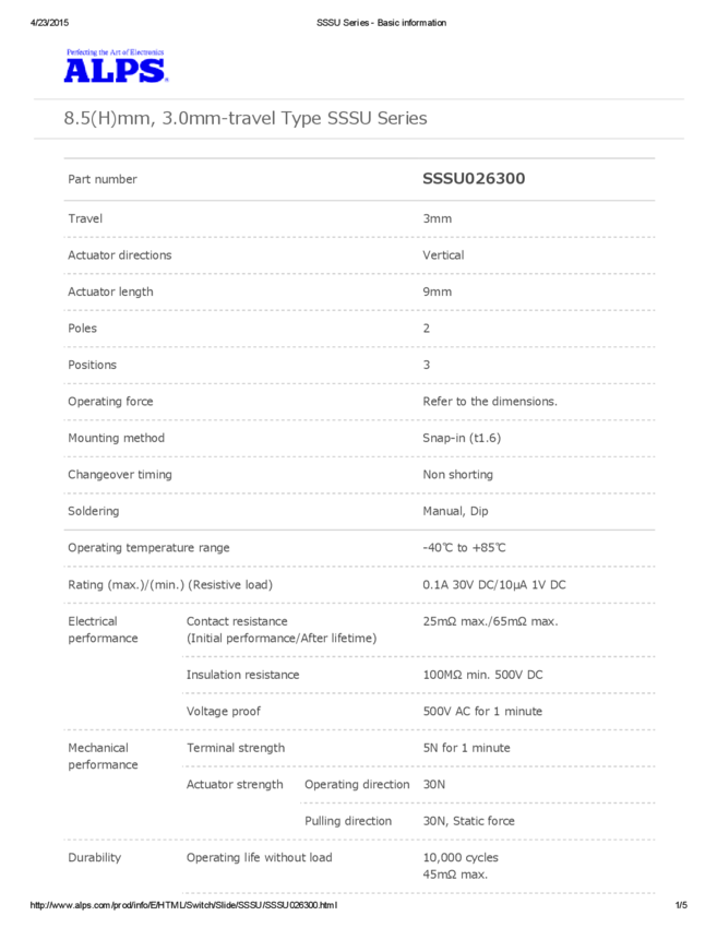 SSSU026300 Switch Slide DP Extended Top Slide 0.1A 30VDC 10000Cycle PC Pins Thru-Hole...