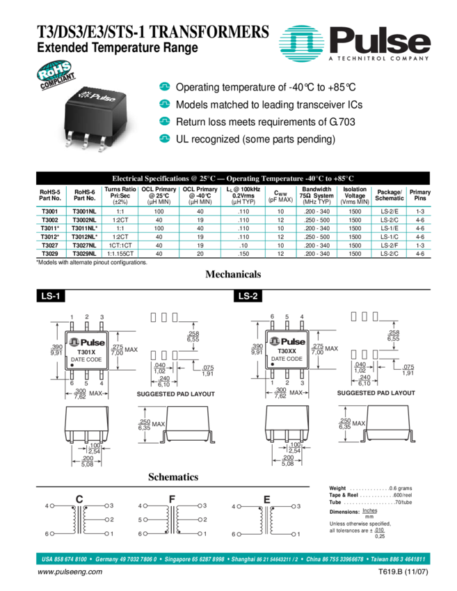 T3002NLT Telecom Transformer 1:2 1500Vrms Surface Mount