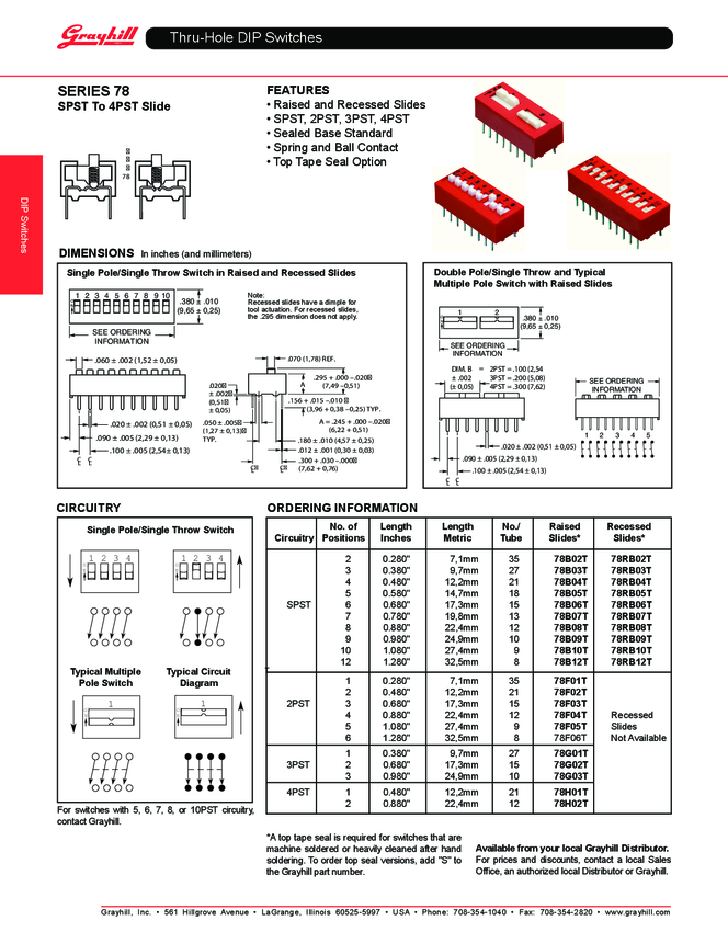 78F05T Switch DIP OFF ON DPST 5 Raised Slide 0.15A 30VDC PC Pins 2000Cycle/SwitchC...