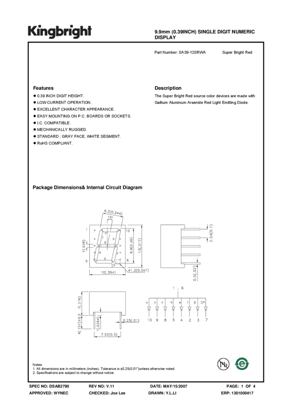 SA39-12SRWA Displays Segmented Panel 1DIGIT 8LED Red 10-Pin DIP Tube