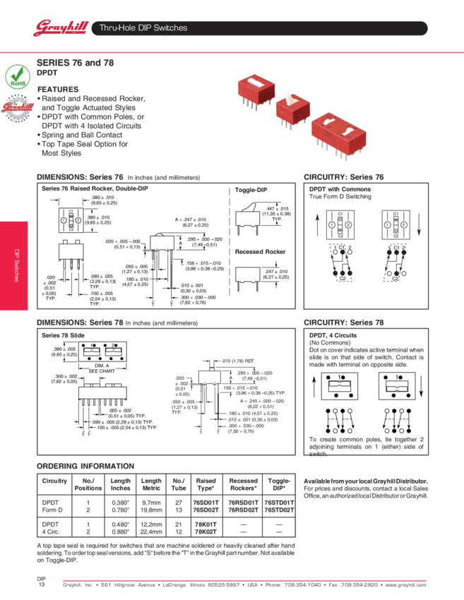 76STD01T Switch DIP ON OFF DPDT 2 Raised Rocker 0.15A 30VDC PC Pins 2000Cycle/Switch...