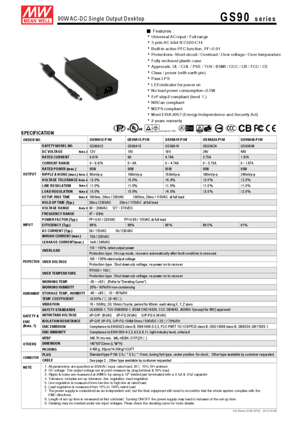 GS90A15-P1M AC/DC Power Supply Single-OUT 15V 6A 90W