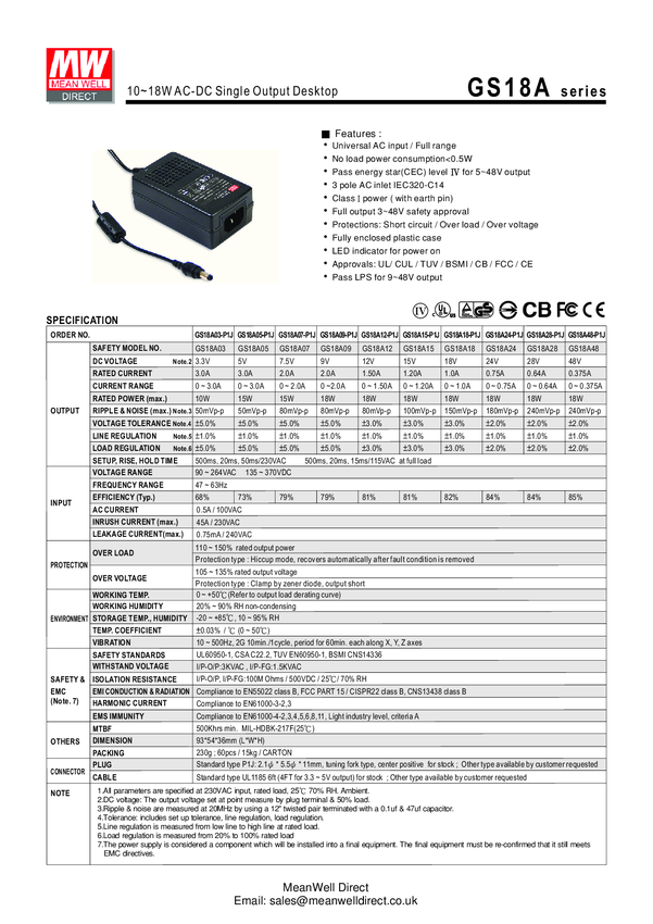 GS18A05-P1J AC/DC Power Supply Single-OUT 5V 3A 15W