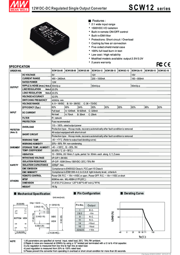SCW12A-12 Module DC-DC 1-OUT 12V 1A 12W 9-PIN DIP