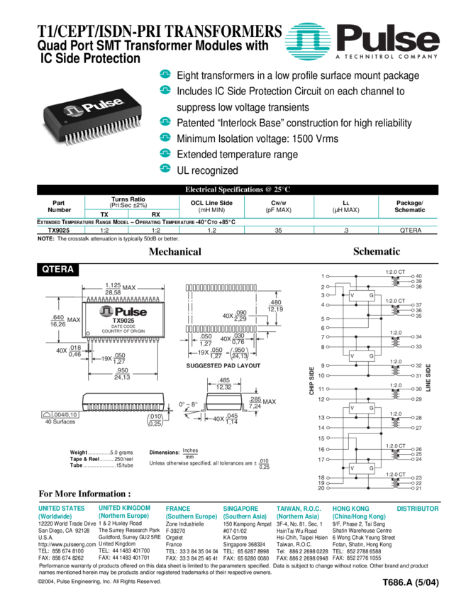 TX9025NL Telecom Transformer 1:2/1:2 1500Vrms Surface Mount