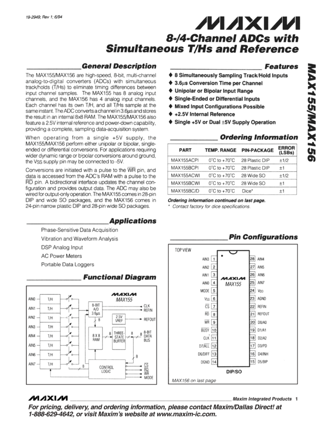 MAX155 MAX155, MAX156 High-Speed, 8-Channel, 8-Bit ADC with Simultaneous Track/Hol...