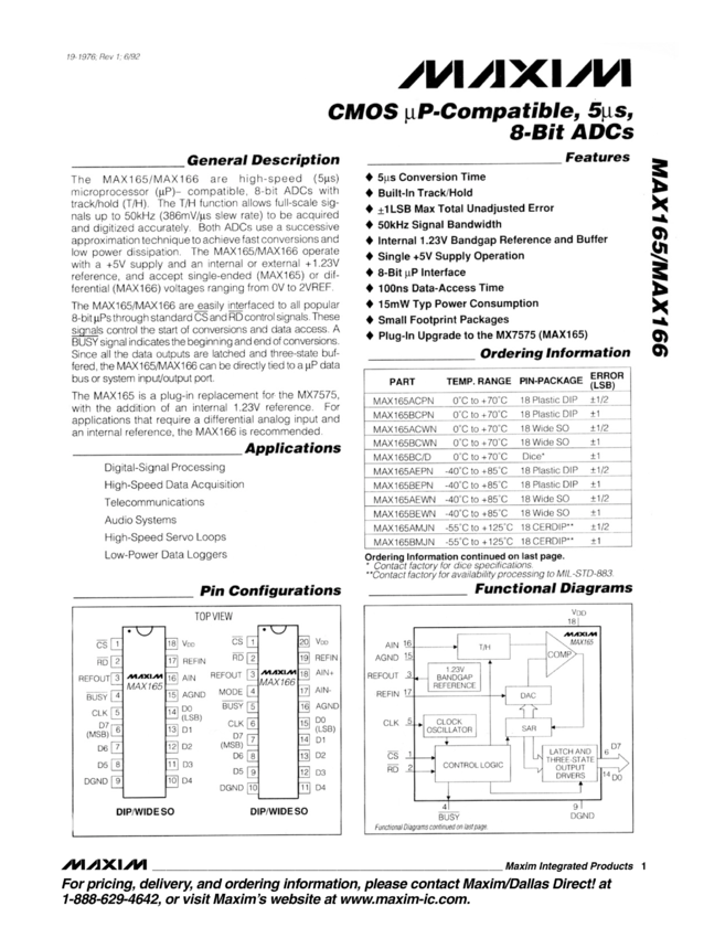 MAX165 MAX165, MAX166 5µs, 8-Bit ADC with Track/Hold and Reference