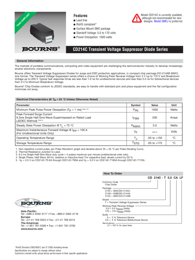 CD214C-T90ALF Diode TVS Single Bi-Dir 48V 1.5KW 2-Pin DO-214AB