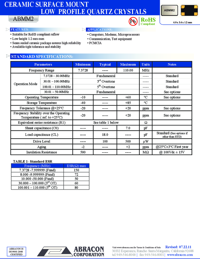 ABMM2-24.576MHZ-E2-T Crystal 24.576MHz 18pF 4-Pin CSMD T/R