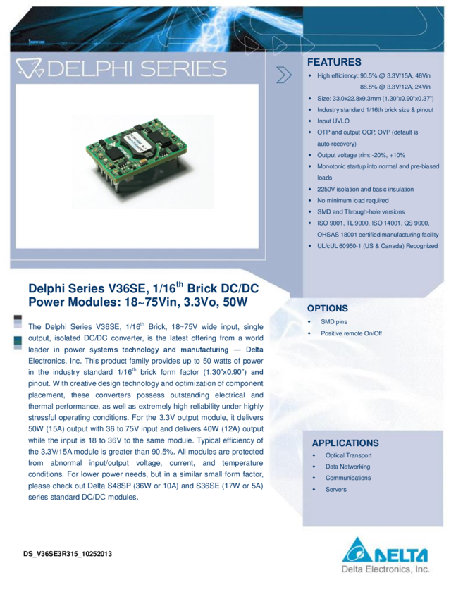 V36SE3R315NRFA Module DC-DC 1-OUT 3.3V 15A 50W 8-Pin 1/16-Brick