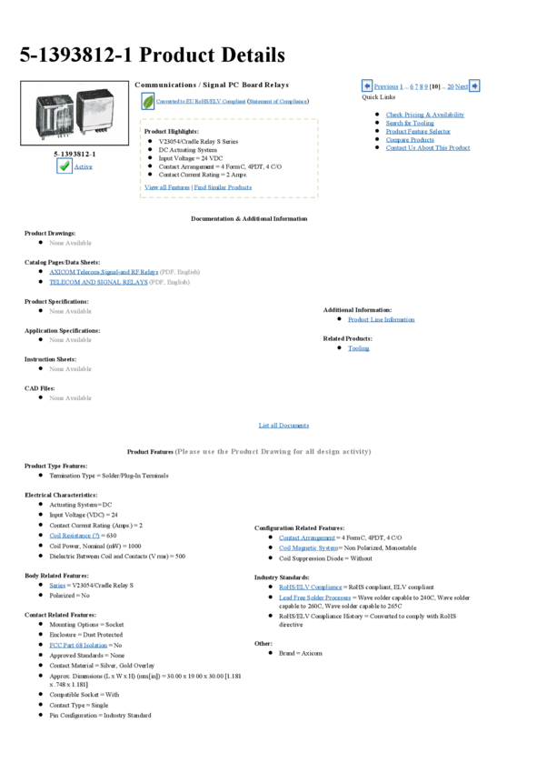 5-1393812-1 Electromechanical Relay 4PDT 2A 24VDC 630Ohm Socket