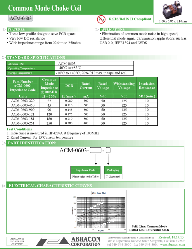 ACM-0603-900-T Ind Common Mode Choke 90Ohm 25% 100MHz Ferrite 500mA 0603 T/R
