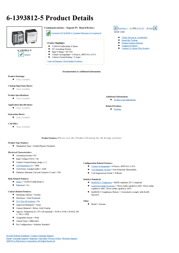 6-1393812-5 Electromechanical Relay 6PST-NO 2A 60VDC 3.8KOhm Socket