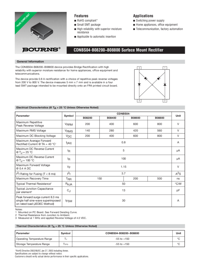 CDNBS04-B08200 Diode Rectifier Bridge Single 200V 0.8A 4-Pin SMT