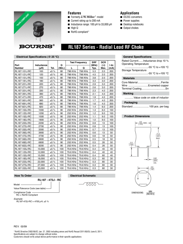 RL187-822J-RC Ind RF Choke 8.2mH 5% 252KHz 90Q-Factor Ferrite 50mA RDL Bag