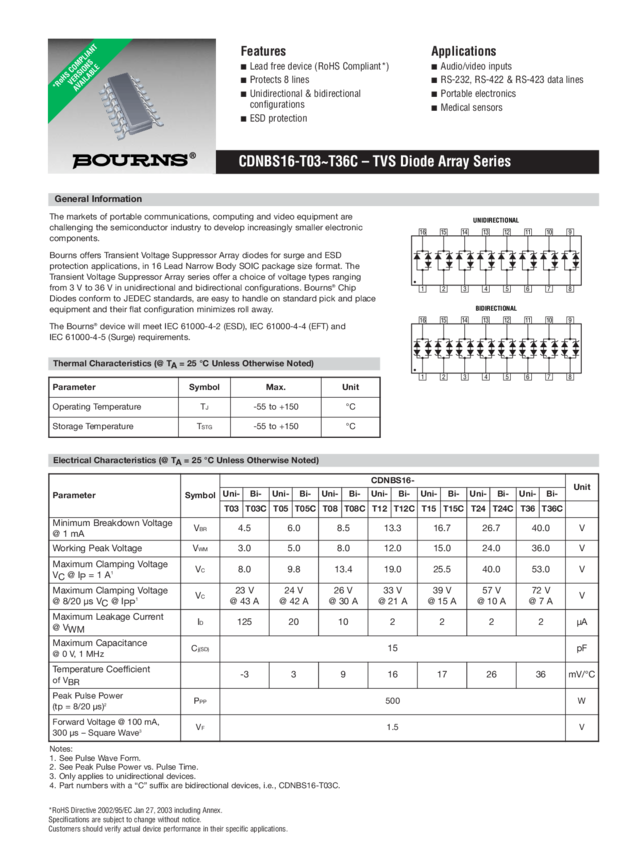 CDNBS16-T36 Diode TVS Octal Uni-Dir 36V 500W 16-Pin SOIC N