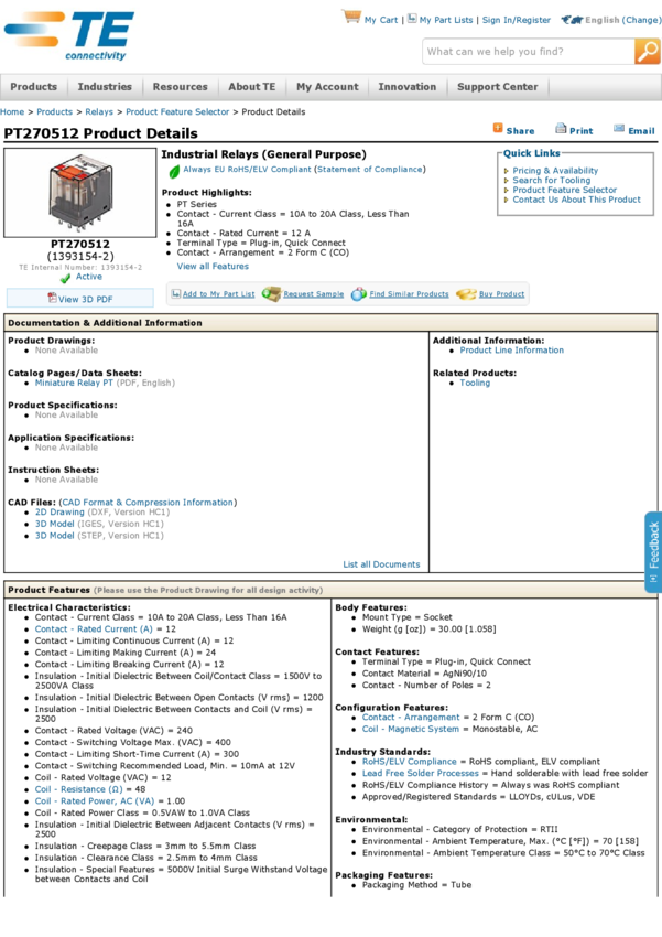 PT270512 Electromechanical Relay DPDT 24A 12VAC 48Ohm Plug-In