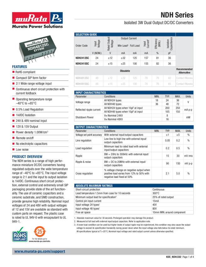 NDH2415SC Module DC-DC 2-OUT 15V/-15V 0.025A/-0.025A 3W 7-Pin SIP