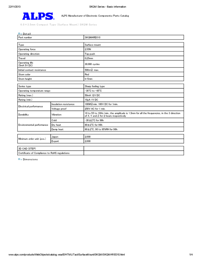 SKQMARE010 Switch Tactile N.O. Button PC Pins 0.05A 12VDC 2.55N Thru-Hole T/R