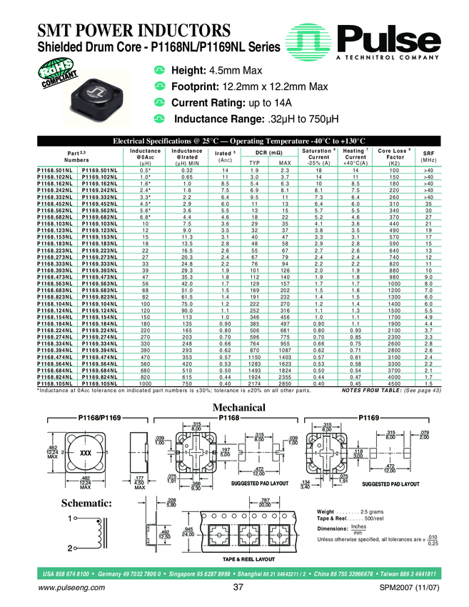 P1168.452NLT Ind Power Shielded Wirewound 15uH 20% 100KHz 3.1A T/R
