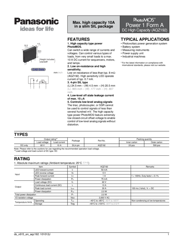AQZ192 Relay SSR 50mA 1.5V DC-IN 10A 60V DC-OUT 4-Pin SIL Carton