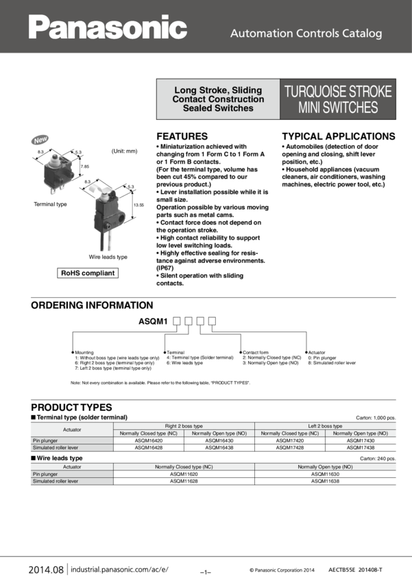 ASQM11620 Switch Snap Action N.C. SPST Pin Plunger Wire Lead 0.05A 16VDC 1.2N Screw M...