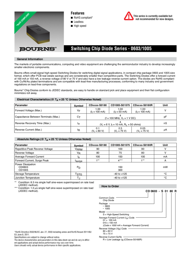 CD1005-S0180 Diode Small Signal Switching 100V 0.15A 2-Pin Case 1005 T/R