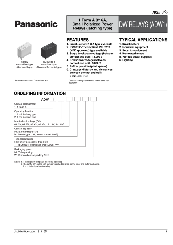 ADW1112HTW Electromechanical Relay SPST-NO 8A 6VDC 180Ohm Through Hole