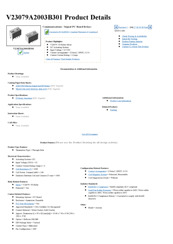 V23079A2003B301 Electromechanical Relay DPDT 2A 12VDC 1.029KOhm Through Hole