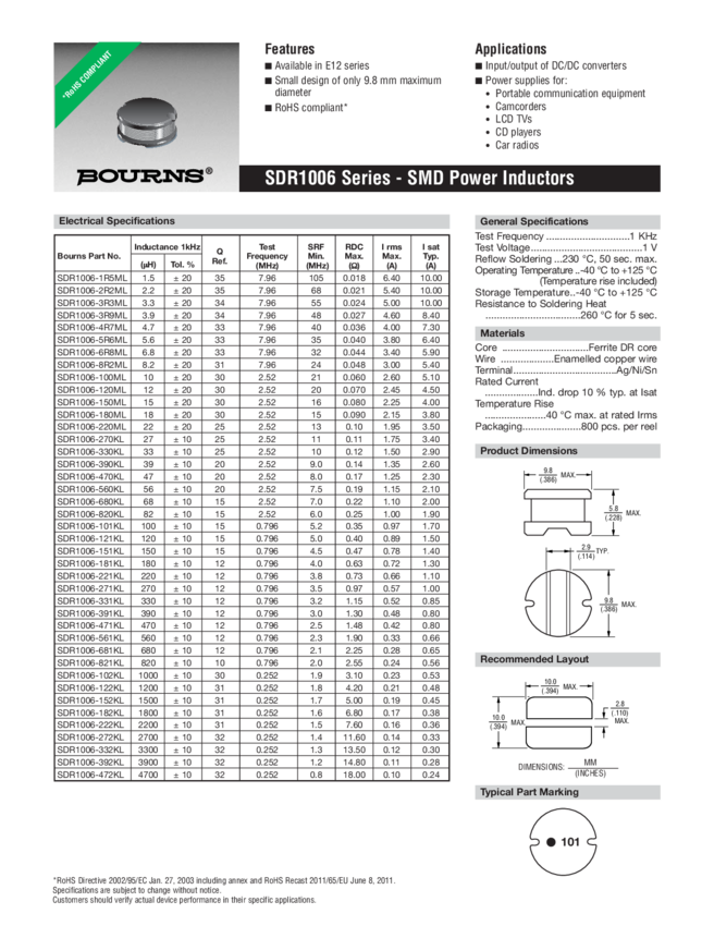 SDR1006-100KL Ind Power Wirewound 10uH 10% 1KHz 30Q-Factor Ferrite 2.6A T/R